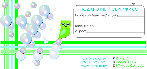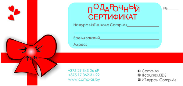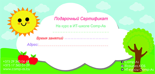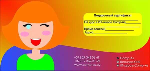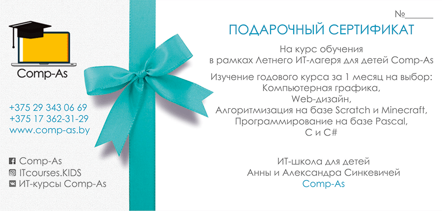 Подарочный сертификат Comp-As дает право изучить за месяц летних каникул годовой курс по таким IT-дисциплинам, как Компьютерная графика, Алгоритмизация на базе Scratch и Minecraft, Web-дизайн, Программирование на языках Pascal, С, С# .